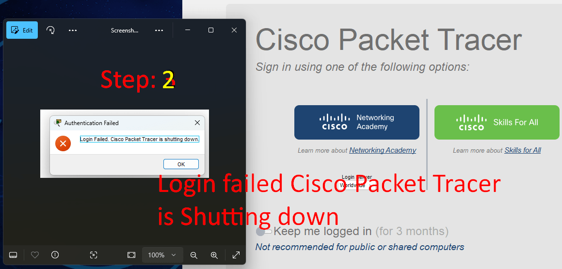 If there is still an error, please try these steps to solve the Login failed issue. You cannot open the Cisco Packet Tracer. Cisco Packet Tracer is shutting down. Step 1. If the issue persists, then proceed to Step 3.