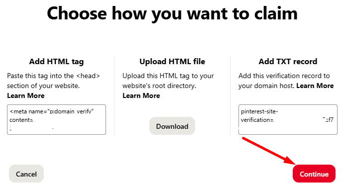 If you don’t have access to your DNS settings, you can use a faster method. Pinterest offers verification via an HTML meta tag. Alternatively, you can upload an HTML file to your website’s root directory.